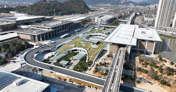 温州机场交通枢纽综合体地下二层和地下一层(局部)为温州市域铁路S1、S2线机场站,该车站内已建成的S1线与在建的S2线实现零换乘,同时与温州龙湾机场T2航站楼连接通道实现无缝连接,真正实现空轨换乘,远期实现空铁换乘,实现空—轨—铁互通。